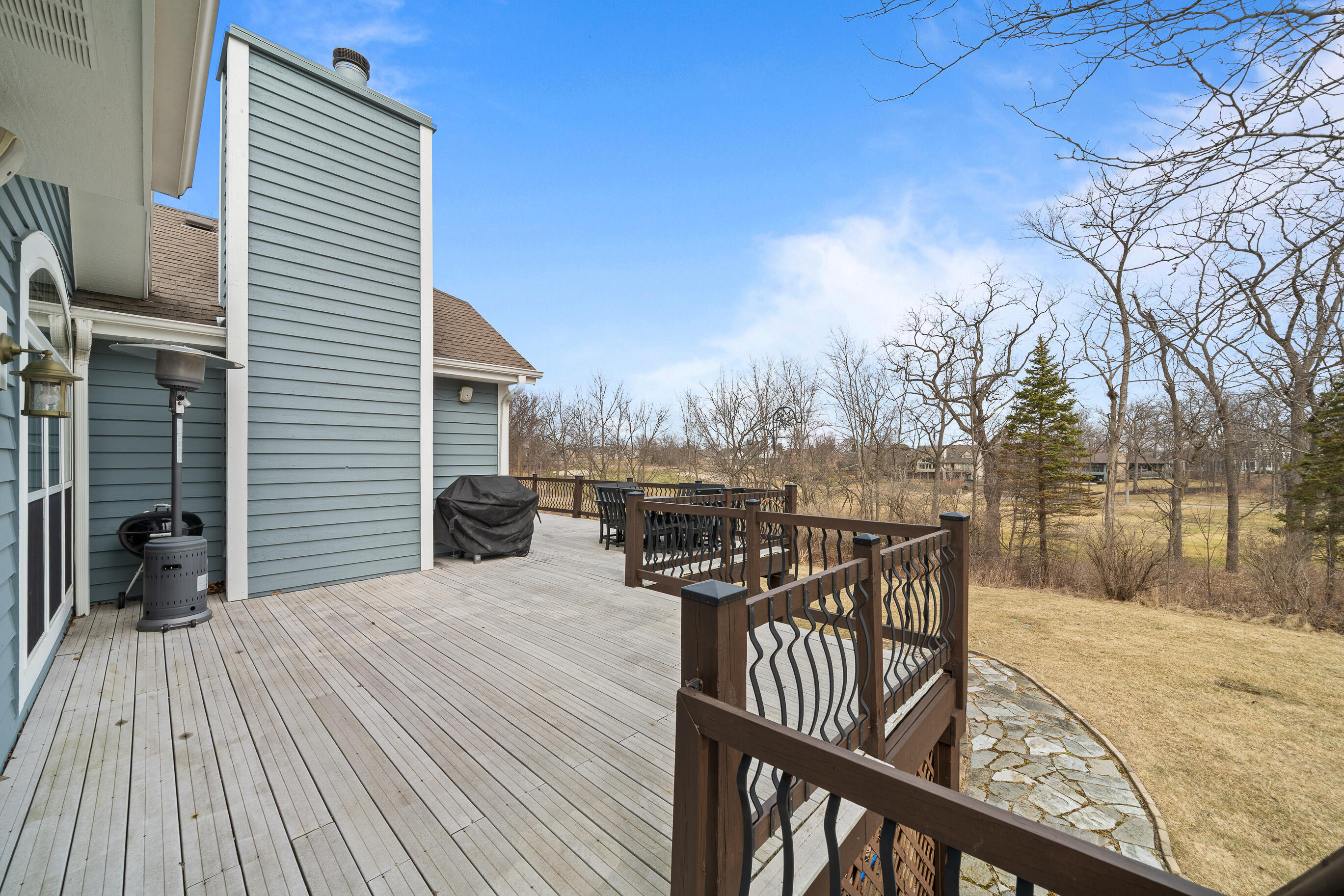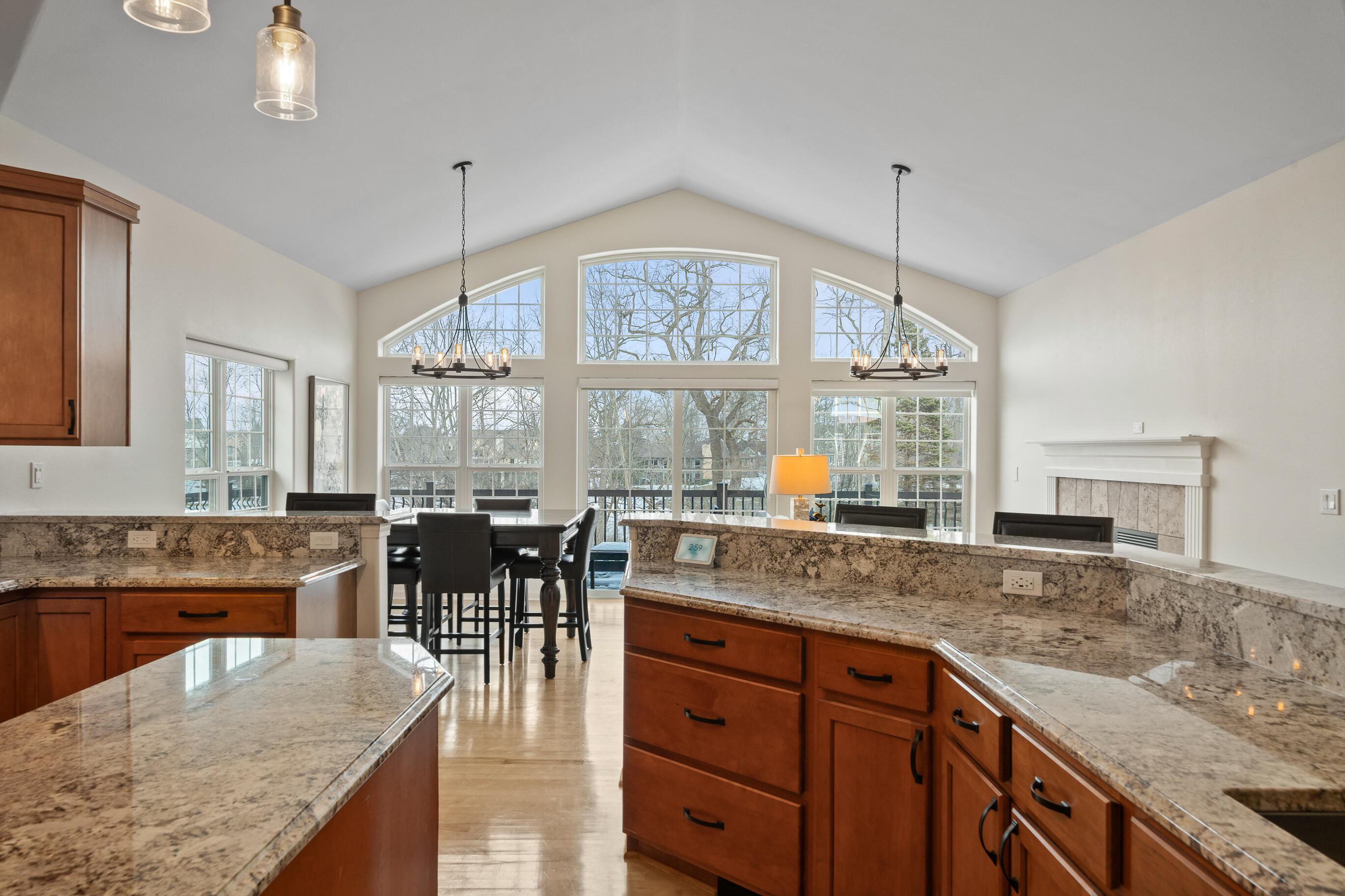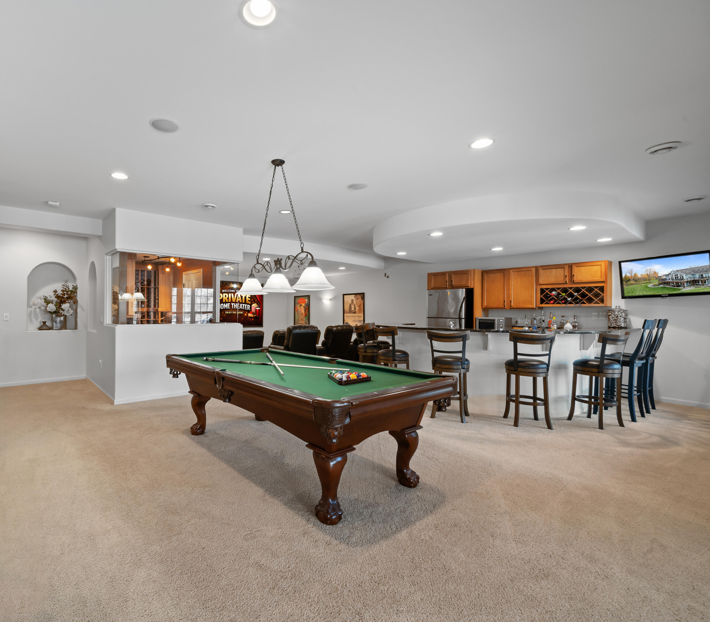 Positioned along the 7th hole of the signature Palmer course, this beautifully crafted raised ranch offers refined living with an open-concept design and soaring ceilings. Featuring 4 bedrooms and 3 baths, the home showcases granite surfaces, rich wood and stone flooring, stainless appliances, a butler's pantry, 2 gas fireplaces, and beautiful spaces for relaxing and entertaining.The primary suite incl. spa-like bath, dual vanities and custom walk-in closet.The lower level presents a theatre room, wine cellar, wet bar, and guest suite. An expansive patio, large deck, spacious yard privacy and views, and an easy walk to pools. Recent updates incl: interior/exterior paint, on demand H20 htr, furnace,whole house humidifier, water softener, air duct cleaning. Swim/racquet, for-fee golf, dining