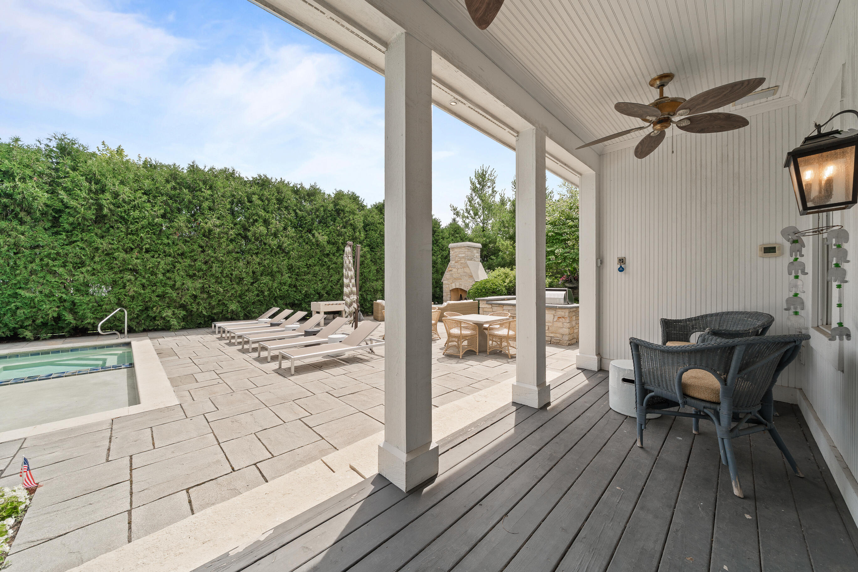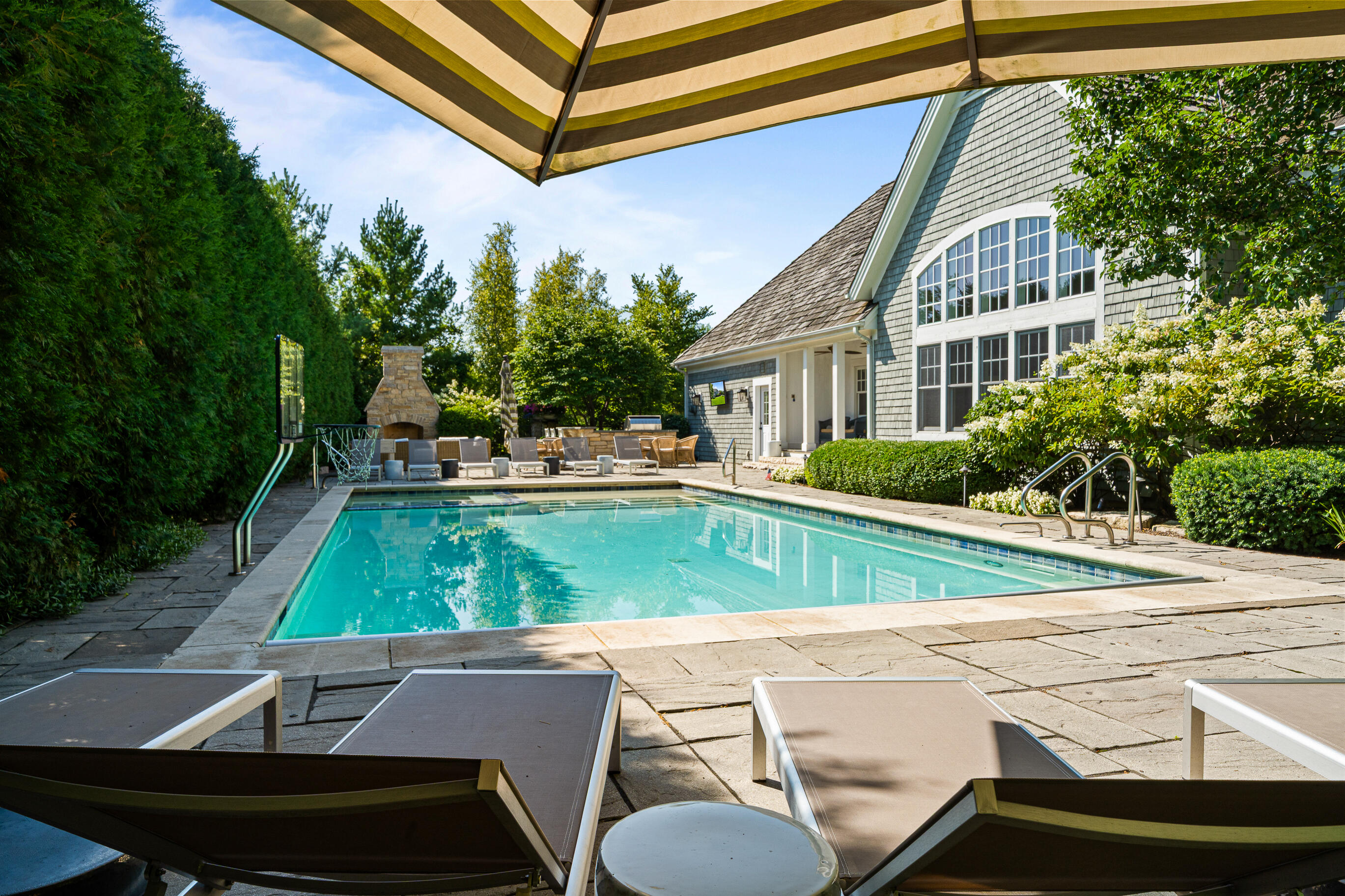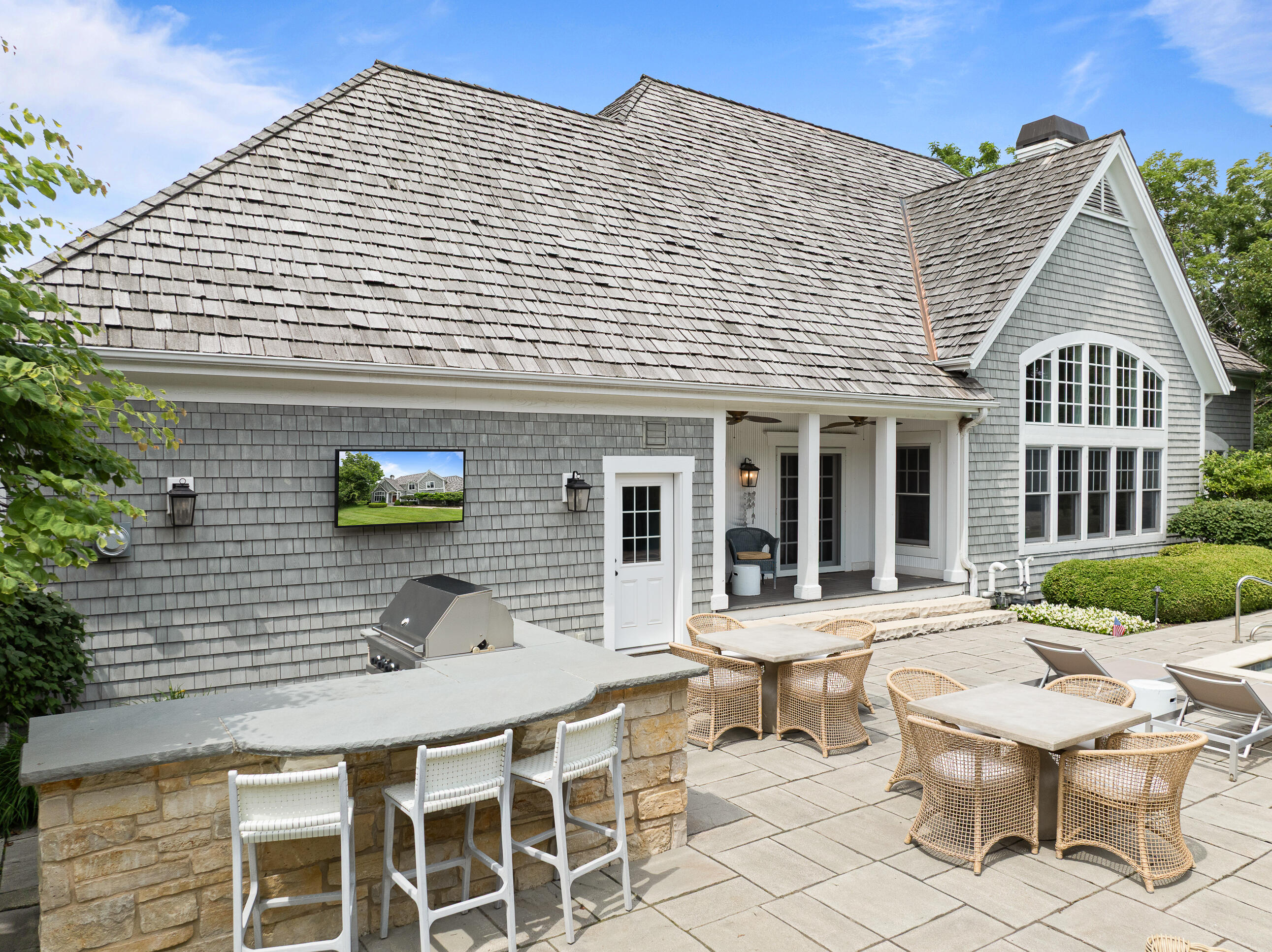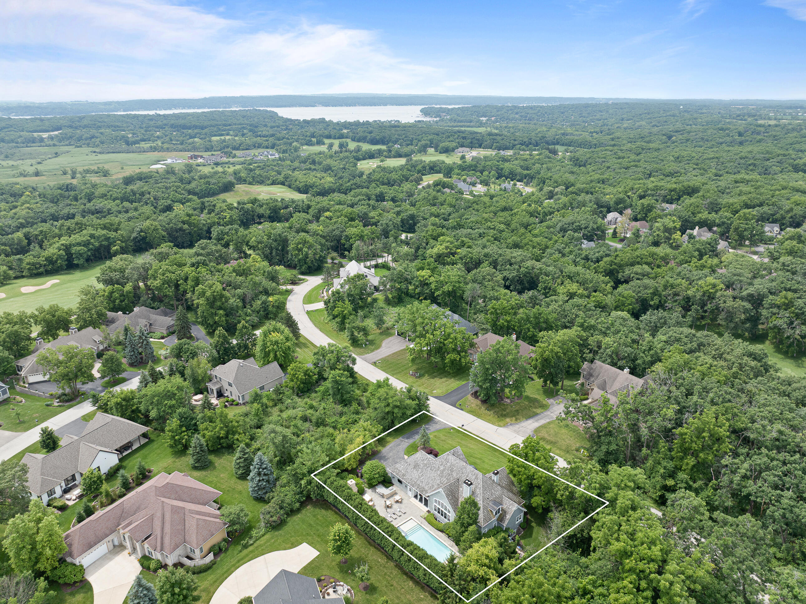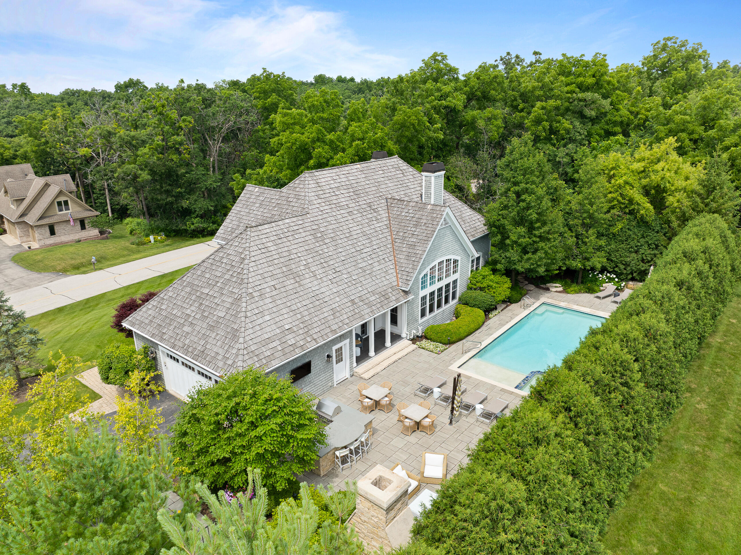 Geneva National is home to this 6-bedroom, 5.5-bath New England-style private retreat. Shielded by lush landscaping, this home is a true escape featuring a heated inground pool with spa, woodburning FP, and outdoor kitchen. Inside, the 2-story great room w/fireplace overlooks the pool, capturing the sense of peace and tranquility.The updated kitchen boasts quartzite counters, upscale appliances and flows seamlessly into a casual dining area that steps out to a covered porch.A family room w/FP, dining room, owner's suite w/FP, guest powder room and laundry complete the main level. Upstairs offers quiet comfort with an en suite bedroom and two additional bedrooms sharing a Jack & Jill bath. Finished LL w/spacious rec room, game/fitness area & en suite guest room. Luxury living at last.