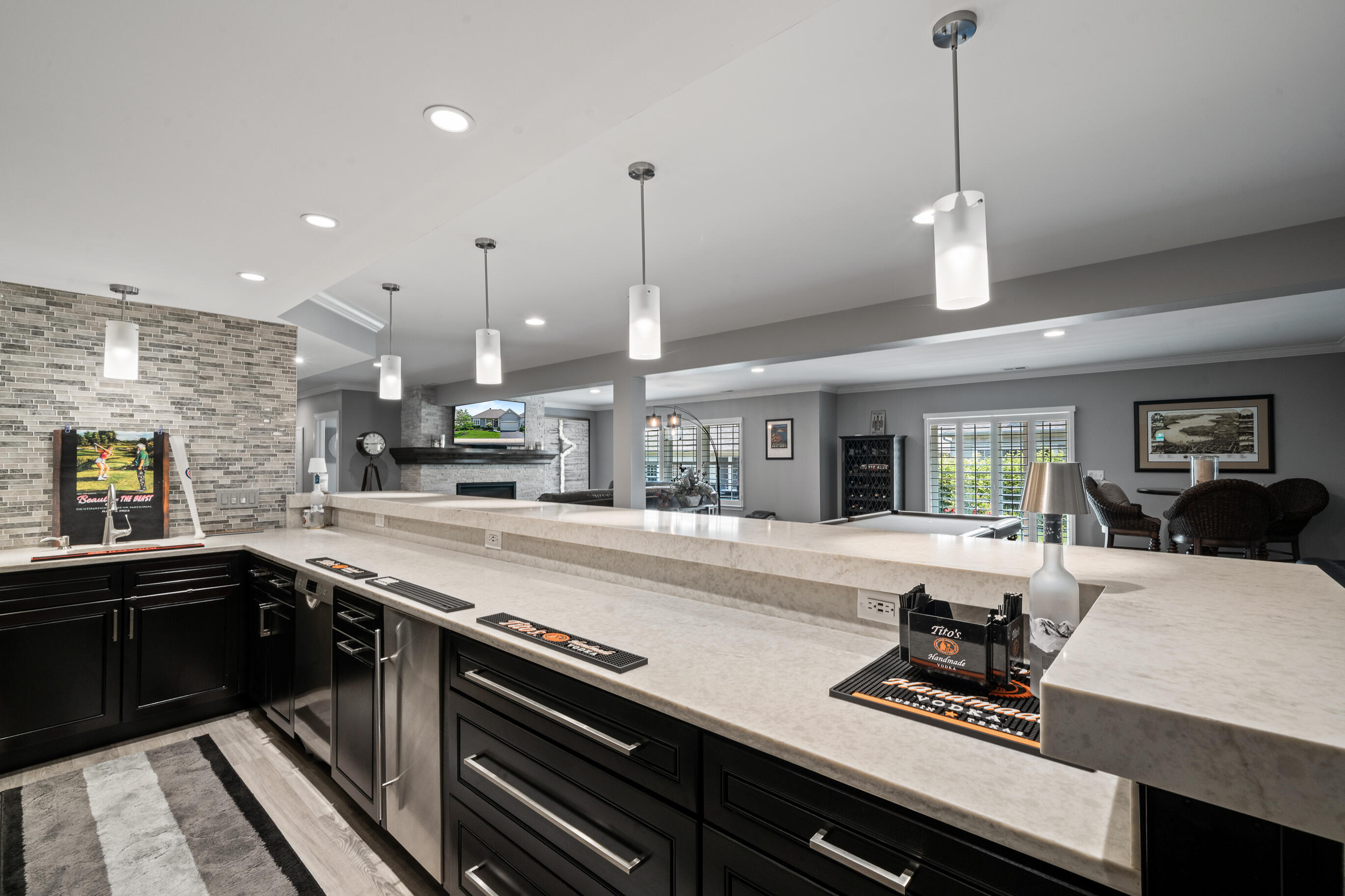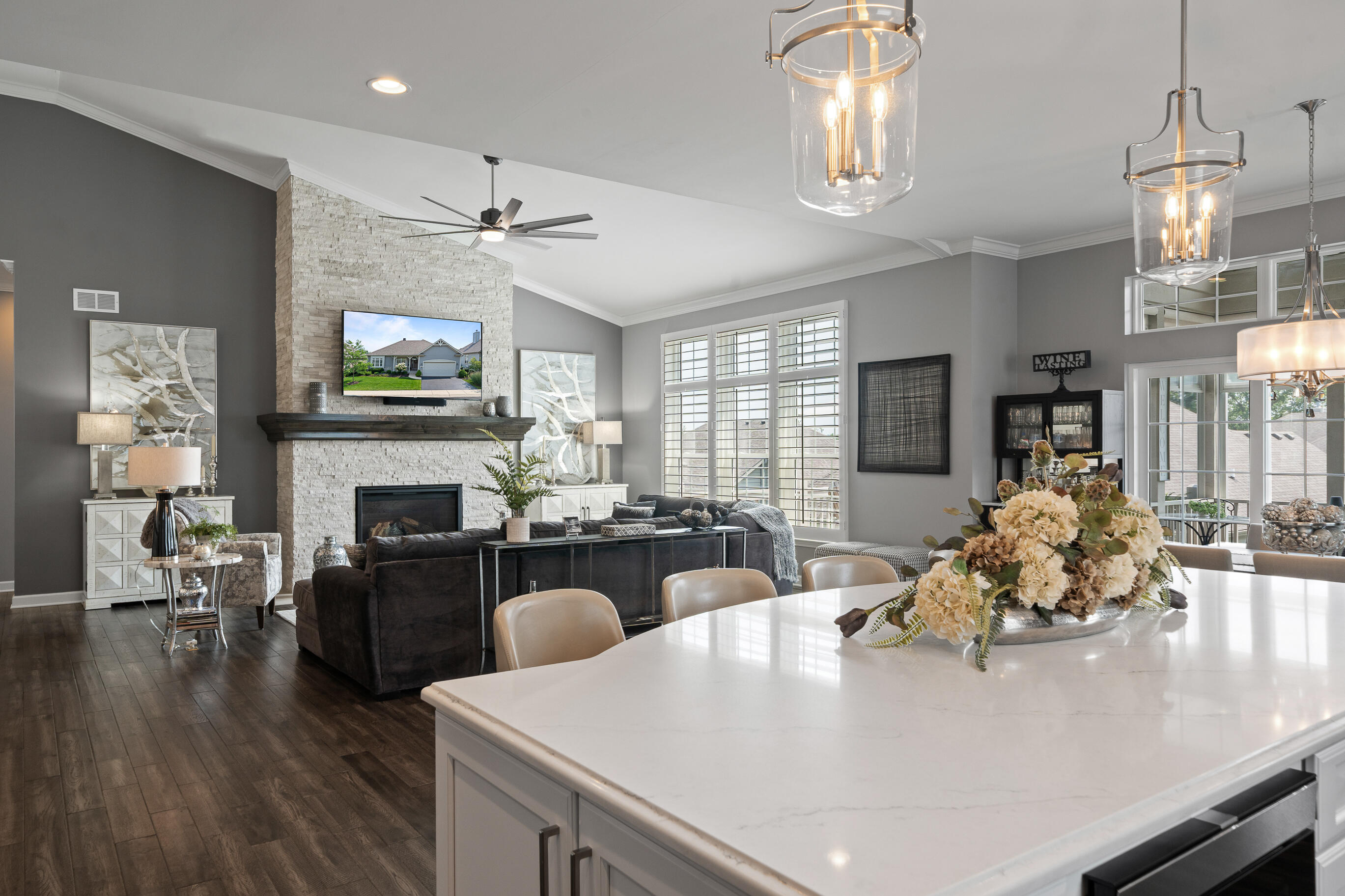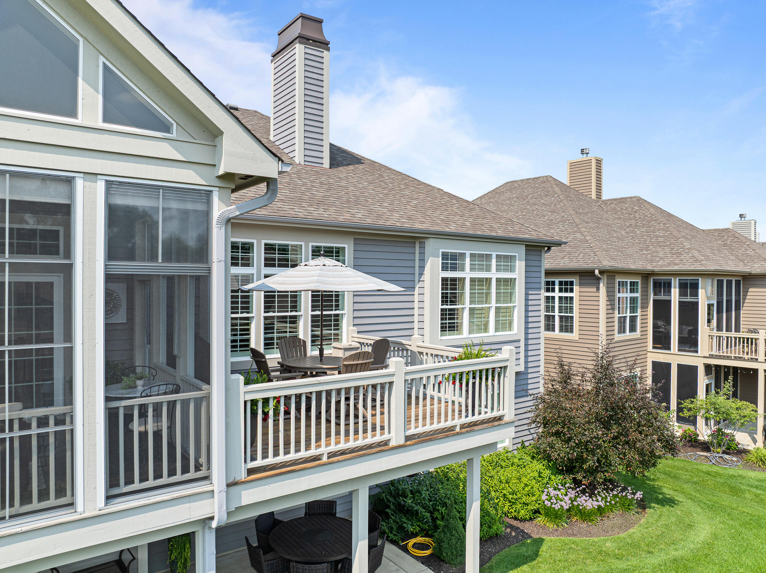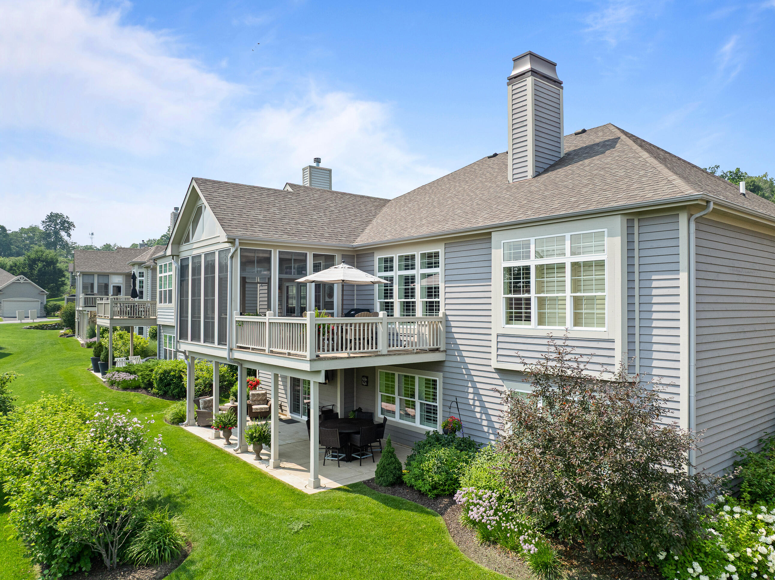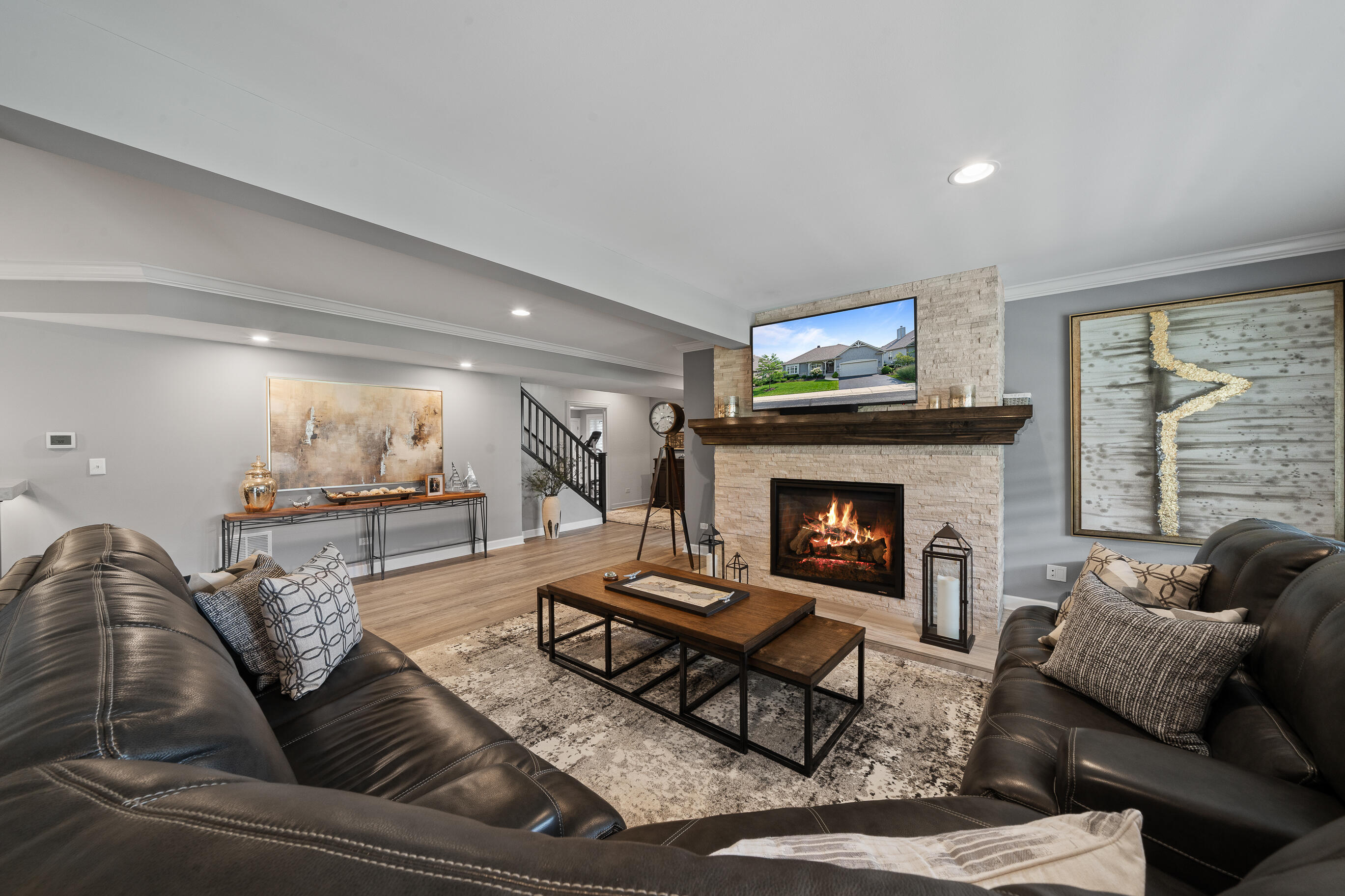 Steps from Geneva Lake, this custom single-family home blends timeless craftsmanship with relaxed sophistication. Sunlight dances across rich wood floors and quartz countertops in a designer kitchen tailored for culinary enthusiasts. The spacious island, built-in dining cabinetry, and inviting great room with a gas fireplace create effortless flow for both gathering and unwinding. The main level showcases a serene primary suite, guest bedroom, and full bath, plus a stunning three-season porch with custom vinyl windows, weatherproof tile, and deck for year-round enjoyment. A beautifully finished, walkout lower level offers two bedrooms, a full tile bath, and a spectacular 14-foot quartzite barperfect for entertaining. Every detail reflects thoughtful design and impeccable care